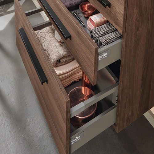 Extra-Slim, Slim-Light, Slim, Massivholz, Classic und Light in unterschiedlicher Optik – modellabhängig mit oder ohne LED, zusätzlich in Bi-Color. Flexible Gestaltung mit breiter oder schmaler vertikaler Platte. Fronten wahlweise mit Griff, mit Griffleiste oder grifflos mit integrierter Technik Push to open. Clevere Details wie ein Wäschebehälter im Schrank, eine Sitztruhe für mehr Komfort und vieles mehr. Maßflexible, offene Regale in nahezu allen Breiten ermöglichen auch in schwierigen Raumsituationen die passgenaue Planung. Verschiedene Keramik-Becken oder edle Glas-Waschbecken wählbar. Imposante Auswahl an Größen, Formen, Materialien und Farben für jeden Einrichtungsstil